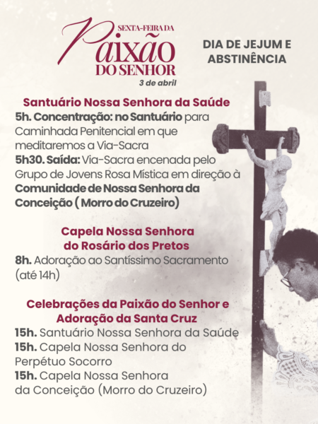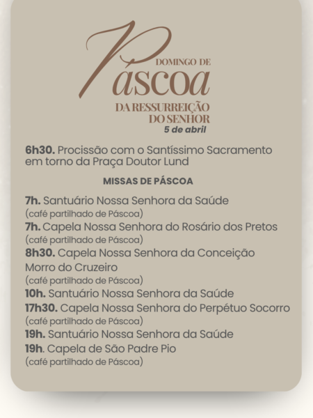 A semana culmina com a Vigília Pascal no Sábado Santo e as Missas de Páscoa com café partilhado no Domingo da Ressurreição. Confira a programação completa abaixo e venha celebrar!