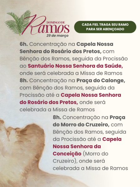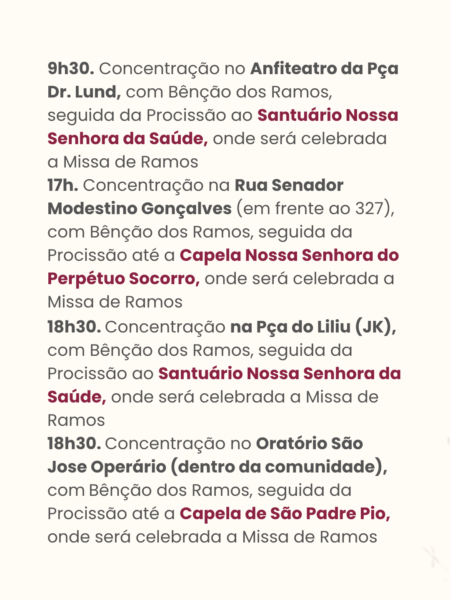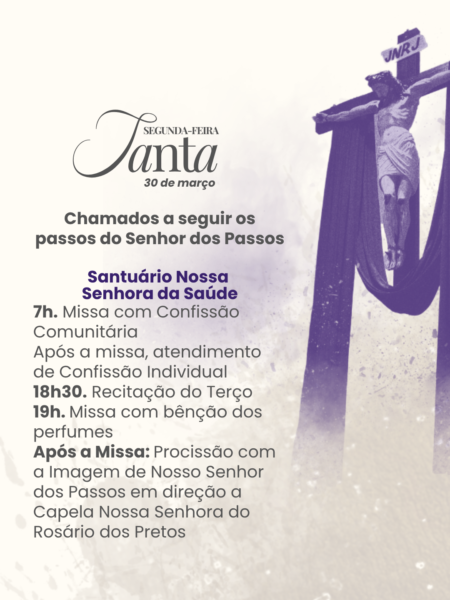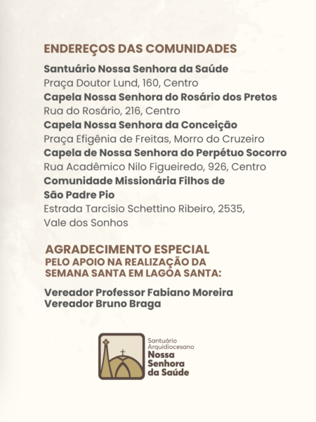 Vivencie os dias mais sagrados do ano com fé e comunidade! O Santuário Arquidiocesano Nossa Senhora da Saúde, em Lagoa Santa, Minas Gerais, preparou uma programação especial de Semana Santa 2026, com procissões pelas ruas da cidade, celebrações nas capelas das comunidades, confissões, adoração e momentos únicos de espiritualidade.
